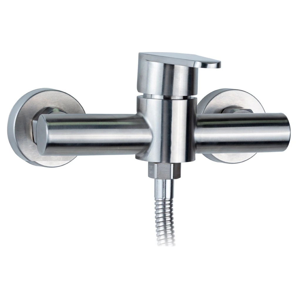 Змiшувач HT Ø35 для душа SS Aquatica Мінімальний тиск в системі водопостачання: 0.5 бар Максимальний тиск в системі водопостачання: 10 бар Водневий показник води (pH): 6.5-8.5 Загальна мінералізація води: не більше 1500 г/м3 Тільки для чистої води без домішок, що містять абразиви (пісок, глину, вапно і т. д.) Модель HT-1D171P – це змішувач для душу Акватика, виконаний з нержавіючої сталі. Тип – одноважільний. Шланг приєднується знизу. Сучасний дизайн і благородний чорний колір дозволяють встановити цей сантехнічний прилад в душових кабінах найдосвідченіших користувачів. Переваги: стійкість до корозії; довговічність; презентабельний дизайн. Змішувач для душу укомплектований шланг з нержавіючої сталі (довжиною 1,5 м), лійкою з двома режимами роботи і утримувачем з ABS-пластику, а також кріпильними елементами. Спосіб монтажу – настінний. Гарантія від виробника надається на 36 місяців з дня покупки