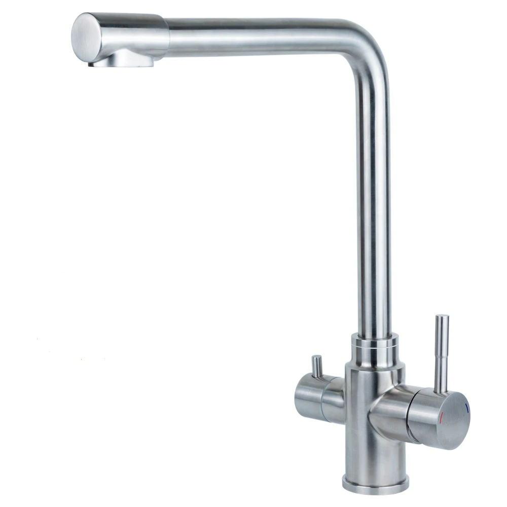 Змішувач KT Ø35 для кухні гусак з виходом для питної води на гайці SS Aquatica Одноважільний змішувач для кухні (модель KT-4B770P) - це відмінне рішення для любителів питної води з системою фільтрації, підключеної до водопроводу. Він стане незамінним помічником для кожного члена сім'ї, адже відрізняється зручністю експлуатації і багатофункціональністю. Корпус виконаний з нержавіючої сталі AISI304, яка зберігає презентабельний зовнішній вигляд протягом довгих років роботи. Вилив високий, Г-подібної форми з функцією аерації, яка збагачує потік води повітрям і знижує її витрата на 10-15%. Завдяки одноважільному управлінню з вбудованим керамічним картриджем, регулювати напір і температуру можна однією рукою. Змішувач для кухні KT-4B770P має ряд переваг: довговічність і безвідмовність; елегантний дизайн; застосування якісних матеріалів; сучасні технології виробництва; 36 місяців гарантії. Комплектація: гнучкі підводи для підключення до магістралі і до фільтрів, ключі для аератора.