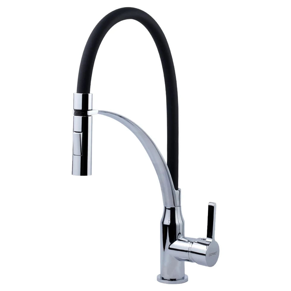 Змішувач OMODEO Ø35 для кухні вилив силіконовий на гайці Corso Переваги: Картридж Ø35 мм керамічний; Покриття хром; Аератор Neperl; Кріплення на втулці з нержавіючої сталі; Гнучка підводка з нержавіючої сталі 1/2"×M8×500 мм - 2 шт; Вага 1650 г; 200 годин в NSS (тест в нейтрально-сольовий камері); Виготовлений з латуні. Основні дані Торгова марка Corso Гарантія, міс 60 місяців