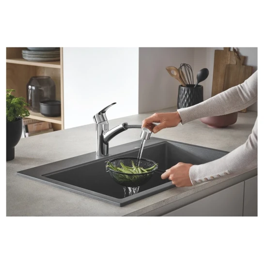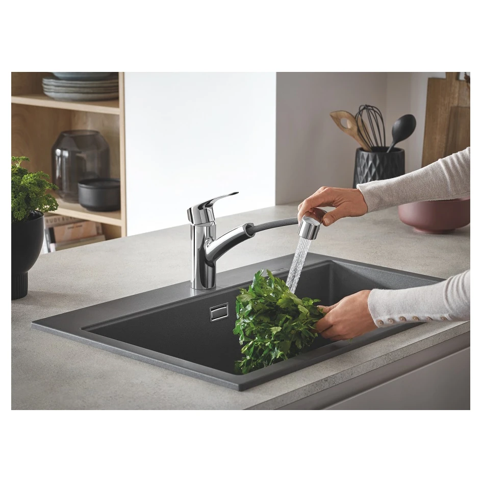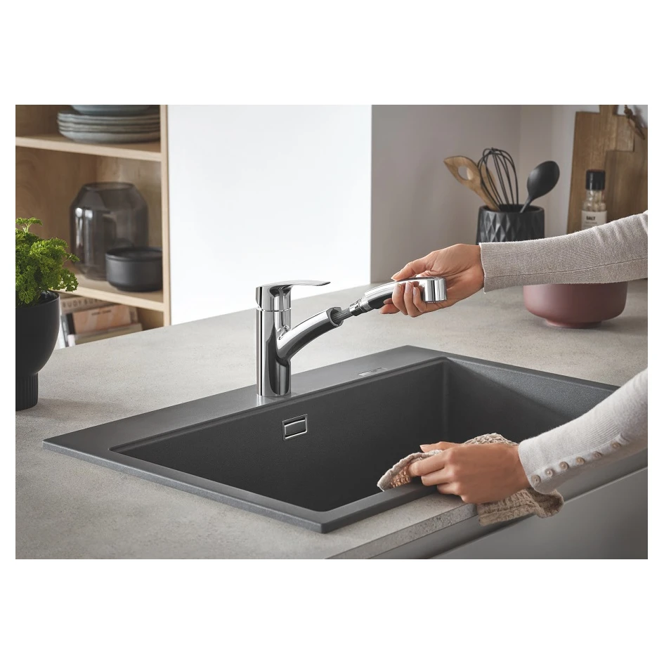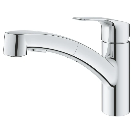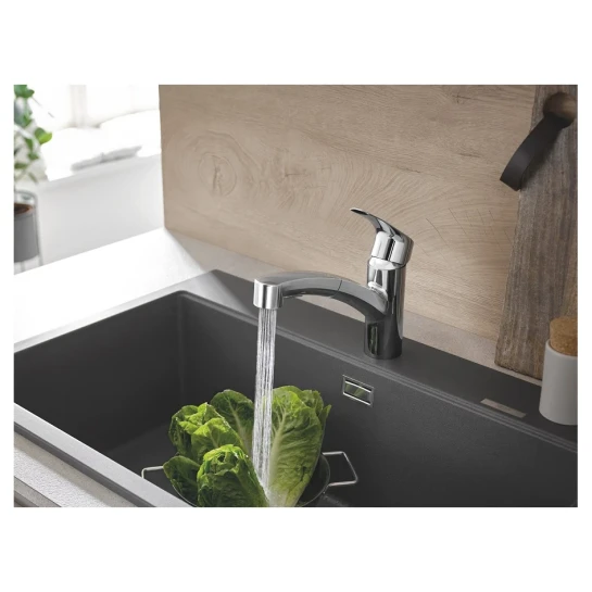 Змішувач для кухні GROHE Eurosmart New — це сучасне рішення, що забезпечує максимальну функціональність і зручність на кухні. Ця модель з висувним виливом робить виконання повсякденних завдань, таких як миття овочів або наповнення великих каструль, значно простішим і комфортнішим.