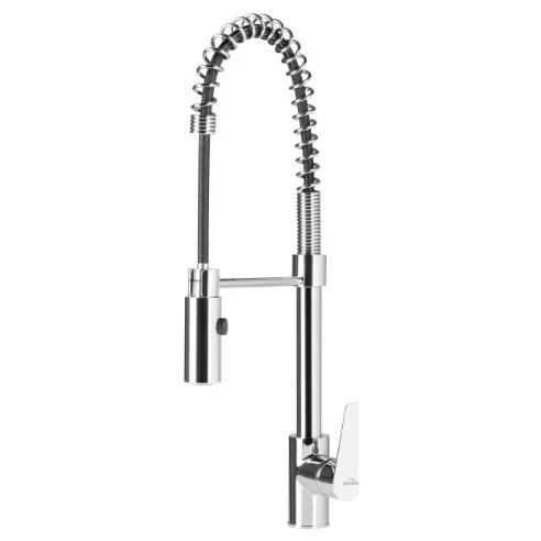INVENA Змішувач для кухонної мийки двохфункційним виливом DOKOS, хром. Змішувач для кухні з пружинним гусаком Invena Dokos BZ-19-S01 Основні характеристики: Виробник: Invena Колір: Хром. Вага: 2 кг. Вид змішувача: Одноважільний Гарантія: 60 місяців офіційної гарантії від виробника. Діаметр підключення шлангів 3/8" Матеріал Латунь. Особливості. Два режими подачі води: душ і струмінь, Висувна лійка. Країна реєстрації бренду: Польща. Тип виливу: З висувним виливом. Підключення: До водопроводу. Шланги: На різьбі звичайні. Шланги підключення: Входять в комплект поставки.