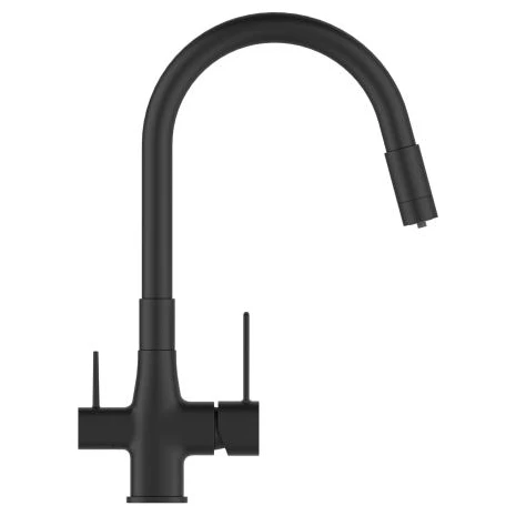 Керування - Одноважільний Тип виливу - Поворотний Фільтрація води - До водопроводу Колір - Чорний Матеріал - Латунь Діаметр під'єднання шлангів - 3/8" Шланги під'єднання - Входять до комплекту постачання Шланги - На різьбі