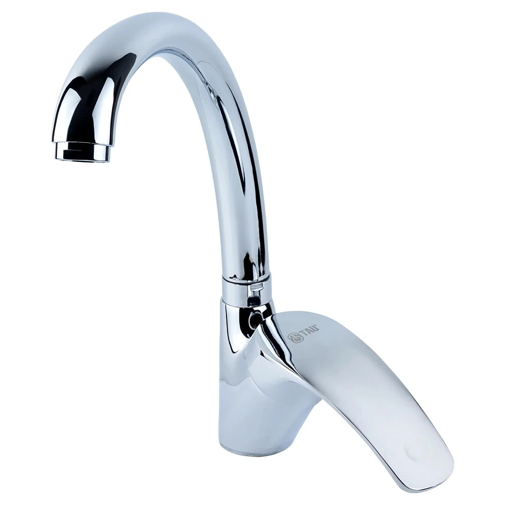 SD-4B443C Змішувач SD Ø40 для кухні гусак вухо лат. шток на гайці TAU Одноважільний змішувач для кухні TAU SD-4B443C виконаний в класичному стилі і підходить для мийок різних конфігурацій. Модель з довгим поворотним виливом J-подібної форми, з захисно-декоративним хромонікелевим покриттям. Картридж - керамічний з діаметром 40 мм, шток - латунний. Переваги: зручне одноручне управління; плавне регулювання подачі води; стійкість до іржавіння і потускнению; тривалий термін служби; швидка установка і простий догляд. Для очищення змішувача для кухні можна використовувати м'яку тканину, губку з мильним розчином або гелевим миючим засобом.
