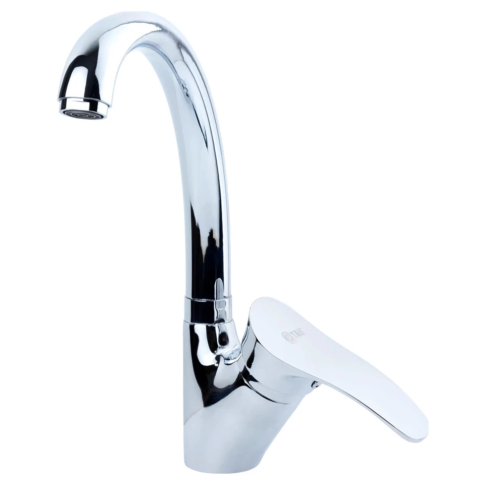 SE-4B445C Змішувач SE Ø40 для кухні гусак вухо лат. шток на гайці TAU Класичний змішувач для кухні TAU SE-4B445C встановлюється на поверхню врізним способом. Дуже добре поєднується з мийками з нержавіючої сталі і керамограніта. Конструктивно цей кран має J-подібний вилив і важіль з керамічним картриджем для регулювання температури і потужності струменя. Шток виконано з латуні. Гусак оснащений аератором, стабілізуючим потік води з економією її споживання. На корпус, гусак і важіль нанесено якісне хромонікелеве покриття. Переваги: класичний дизайн; плавне і безшумне управління; швидка установка; легкий догляд. Змішувач для кухні SE-4B445C можна протирати м'якою тканиною з мильним розчином або миючим гелем. Гнучкі підводи і кріплення поставляються в комплекті. Гарантія - 12 місяців