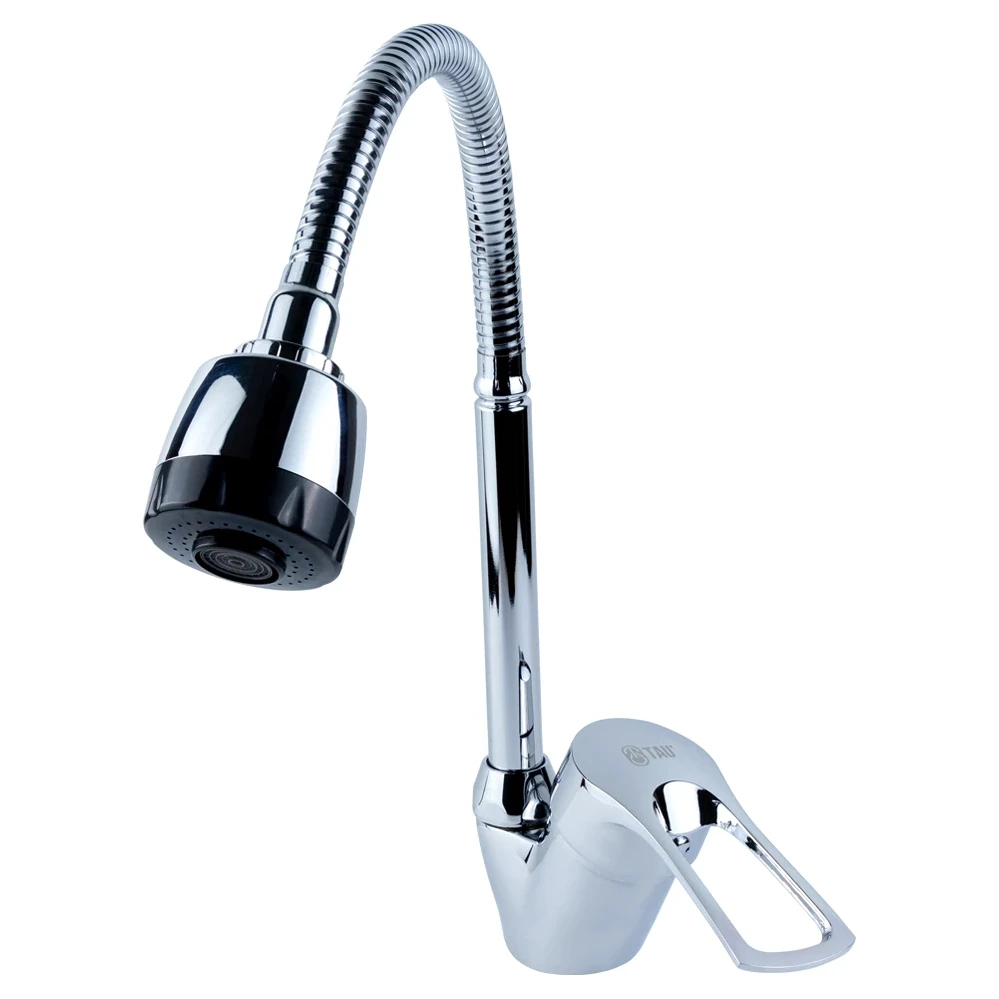 Змішувач SM Ø40 для кухні гусак гофрований на гайці TAU (SM-4B644C) Модель SM-4B644C - це одноважільний змішувач для кухні з гнучким гофрованим зливом висотою 285 мм і аератором з 2-ма режимами роботи. Така конструкція змішувача дозволяє мити посуд будь-яких габаритів, змінюючи кут напрямку, висоту і силу струменя. Завдяки хромонікелевому покриттю кран захищений від корозії, а також дрібних механічних пошкоджень. Прямокутний важіль з наскрізним отвором дозволяє зручно регулювати напір і температуру води. Змішувач SM-4B644C стане незамінним помічником на кухні в сім'ях з великою кількістю людей, а також в закладах громадського харчування. Переваги: стильний дизайн; зручне управління; потужна аерація; швидкий монтаж; ідеальне співвідношення «ціна-якість». Для підключення до магістралі в комплекті є 2 гнучких підведення і кріпильна гайка. Гарантія на виріб - 12 місяців.