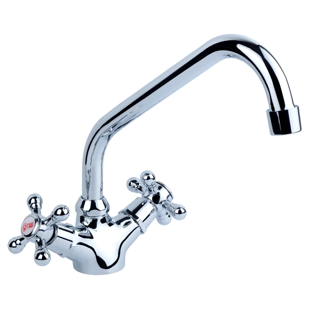 Змішувач VD 1/2" для кухні на гайці TAU (VD-4B161C) VD-4B161C - це змішувач для кухні з поворотним зігнутим гусаком (винос 20 см) і двома вентилями хрестоподібної форми з заглушками, на які нанесені червоний і синій логотип TAU для позначення гарячої та холодної води. Такий кран підійде для мийок великих розмірів, виготовлених з нержавіючої сталі або керамограніта. Переваги: антикорозійне хромонікелеве покриття; довговічні латунні кран-букси; стабілізуючий потік сітчастий аератор; швидка установка і простота експлуатації. Двохвентильний змішувач для кухні VD-4B161C монтують на горизонтальну площину і фіксують гайкою. Для підключення до магістралі в комплекті поставляються 2 гнучких підведення. Гарантія на виріб - 12 місяців.