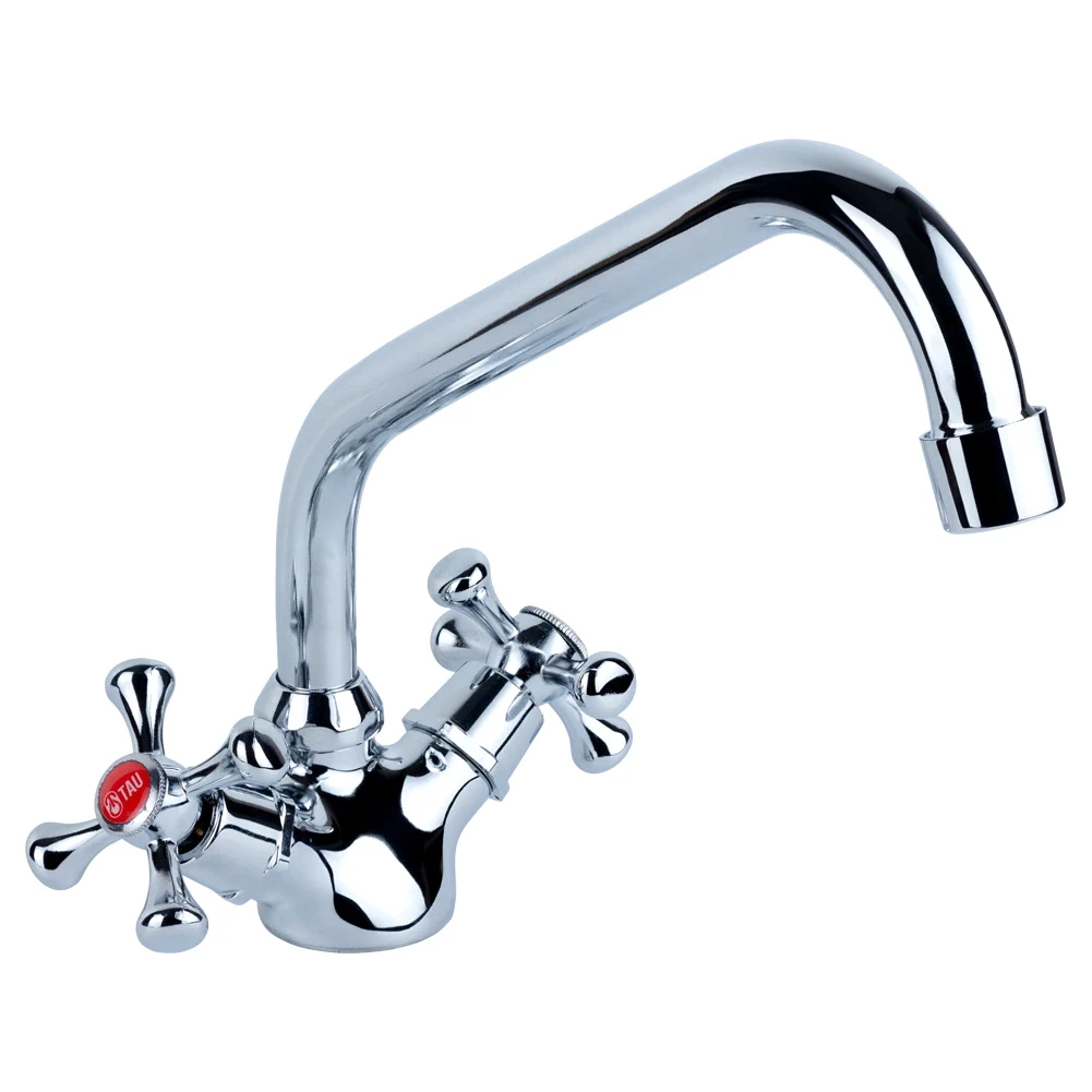 Змішувач VN 1/2" для кухні на гайці TAU (VN-4B160C). Змішувач для кухні VN-4B160C представляє бюджетну лінійку кранів з дворучним керуванням. Форма гусака - вигнута під двома кутами (J-подібна). Сам вилив має функцію обертання на 360 градусів, тому мити посуд і продукти буде зручно. Усередині встановлені довговічні латунні кран-букси з керамічними дисками. Корпус вироби має глянсове хромонікелеве покриття, що захищає від іржавіння і незначних механічних пошкоджень. Двохвентильний змішувач для кухні ТАУ обов'язково сподобається цінителям класики і простоти. Переваги: інтуїтивно зрозуміле управління; доступні комплектуючі; легкий монтаж і ремонт; невибагливість у догляді; доступна ціна. Кріпиться такий двухвентильний кран горизонтально до мийки за допомогою спеціальної гайки. Для підключення до магістралі гнучкі підводи поставляються в комплекті. Гарантія 1 рік.