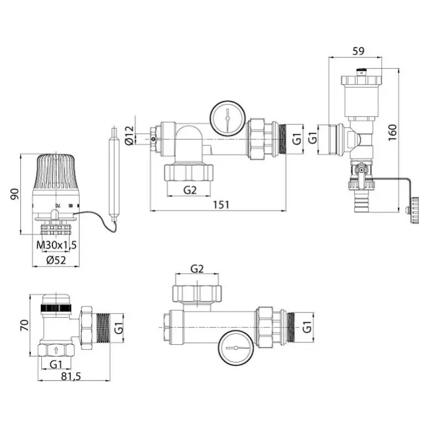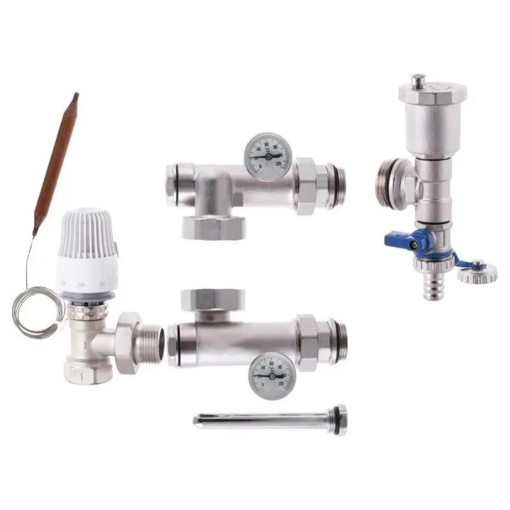 Змішувальний вузол для колектора KARRO з кутовим термостатичним краном 3/4" вирішує завдання регулювання температури теплоносія, що надходить в труби системи «тепла підлога», а також призначений для під’єднання циркуляційного насоса. У комплект входят: конектор для підключення насоса; кінцевий елемент колектора з автоматичним повітровідвідником та дренажним краном, 2 термометри, кутовий термостатичний кран, термоголовка з виносним зондом. Діапазон шкали термометра: від 20 до 120 °C. Максимальна температура теплоносія в первинному контурі: 90 °C. Діапазон налаштування температури у вторинному контурі становить 20–60 градусів Цельсію. Матеріал корпусу: нікельована латунь.
